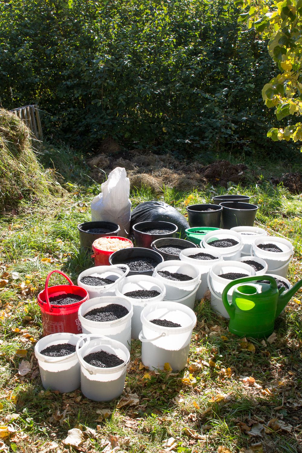 Vor der Ausbringung im Garten sollte die Kohle mit anderen nährstoffreichen Reststoffen kompostiert werden, damit die freien Nährstoffspeicherplätze der Kohlepartikel sozusagen „belegt“ werden. Als Vorschlag für einen Terra Preta Kompost habe ich im Internet folgende Zusammensetzung gefunden: