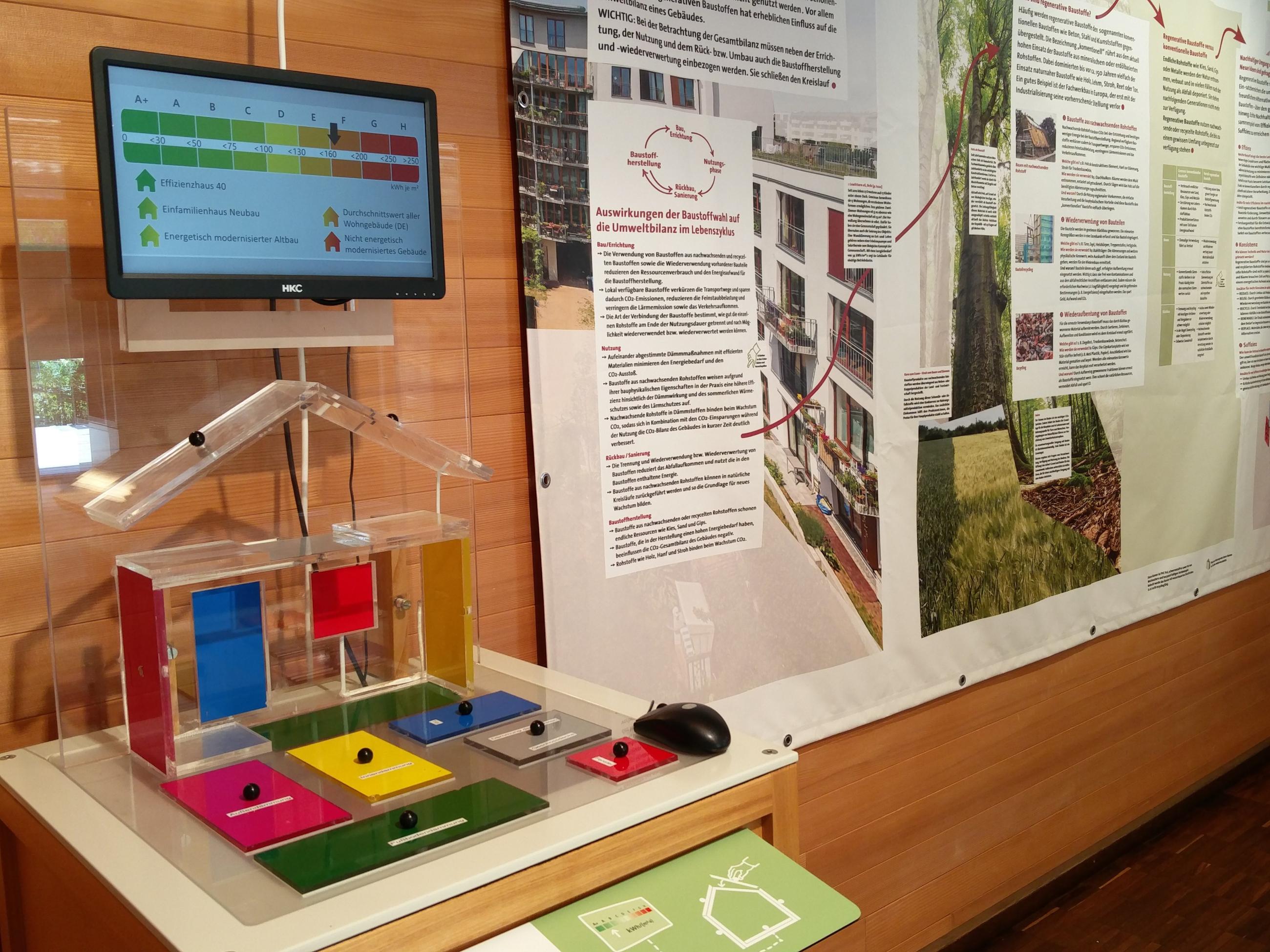 Im Ausstellungsraum befinden sich einige Stationen zum anfassen und ausprobieren. Hier kann direkt verglichen werden, welche Materialien wie wirksam sind und wie die ökologischen Materialien – wie Holz oder Stroh - im Vergleich zu den konventionellen – wie Glaswolle oder Steinwolle - abschneiden.