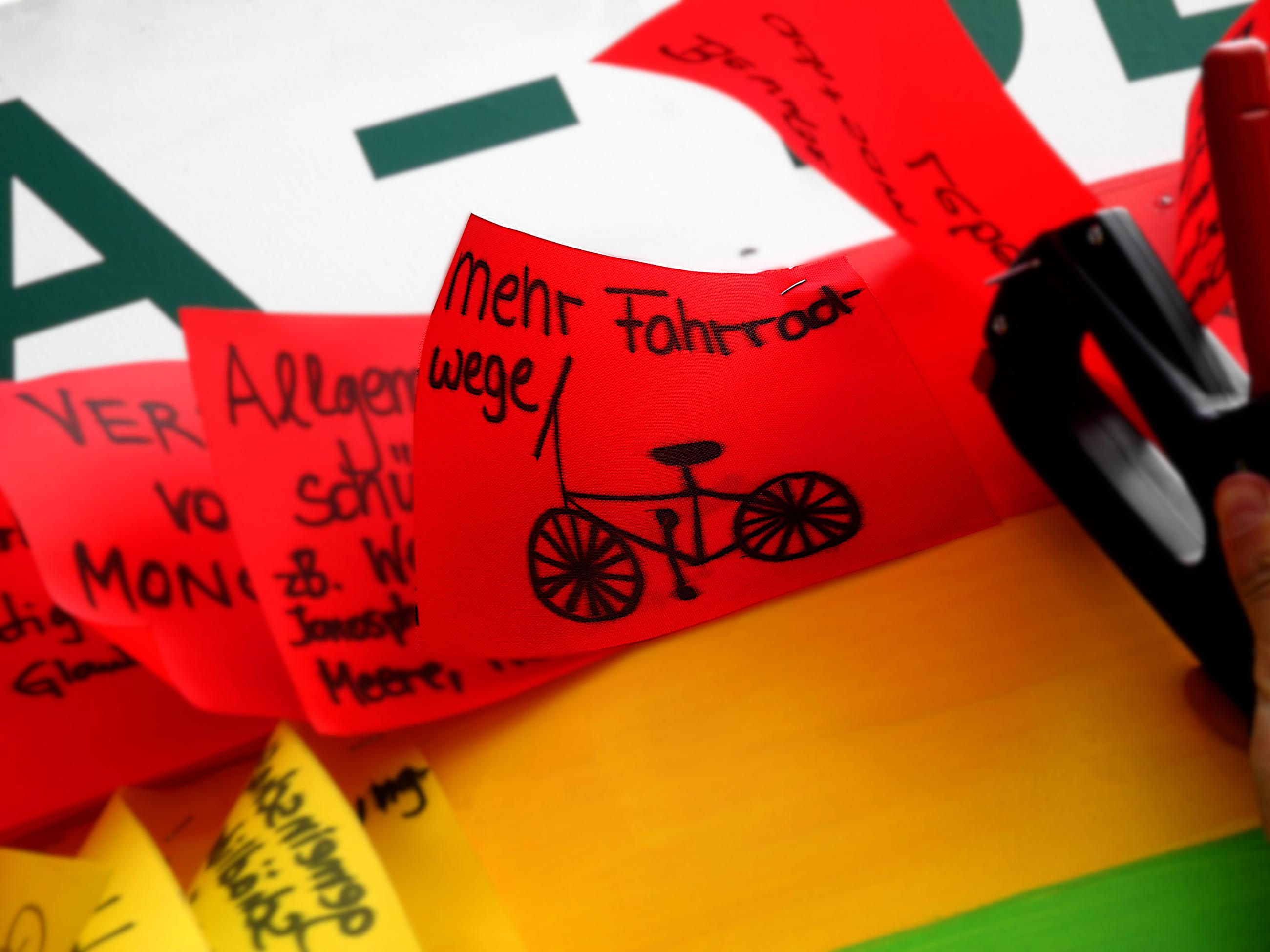 Die Freiburger Menschen, die den Regenbogen mit ihren Wünschen beleben, träumen unter anderem von Veränderungen im Verkehr, Ressourcenschutz und mehr Nachhaltigkeit, so Jonas Pyschik und Agnès Lamacz von Greenpeace Freiburg. Auch viele Kinder seien vorbei gekommen. Ein Kind malt ein Fahrrad auf seinen roten Regenbogenstreifen.