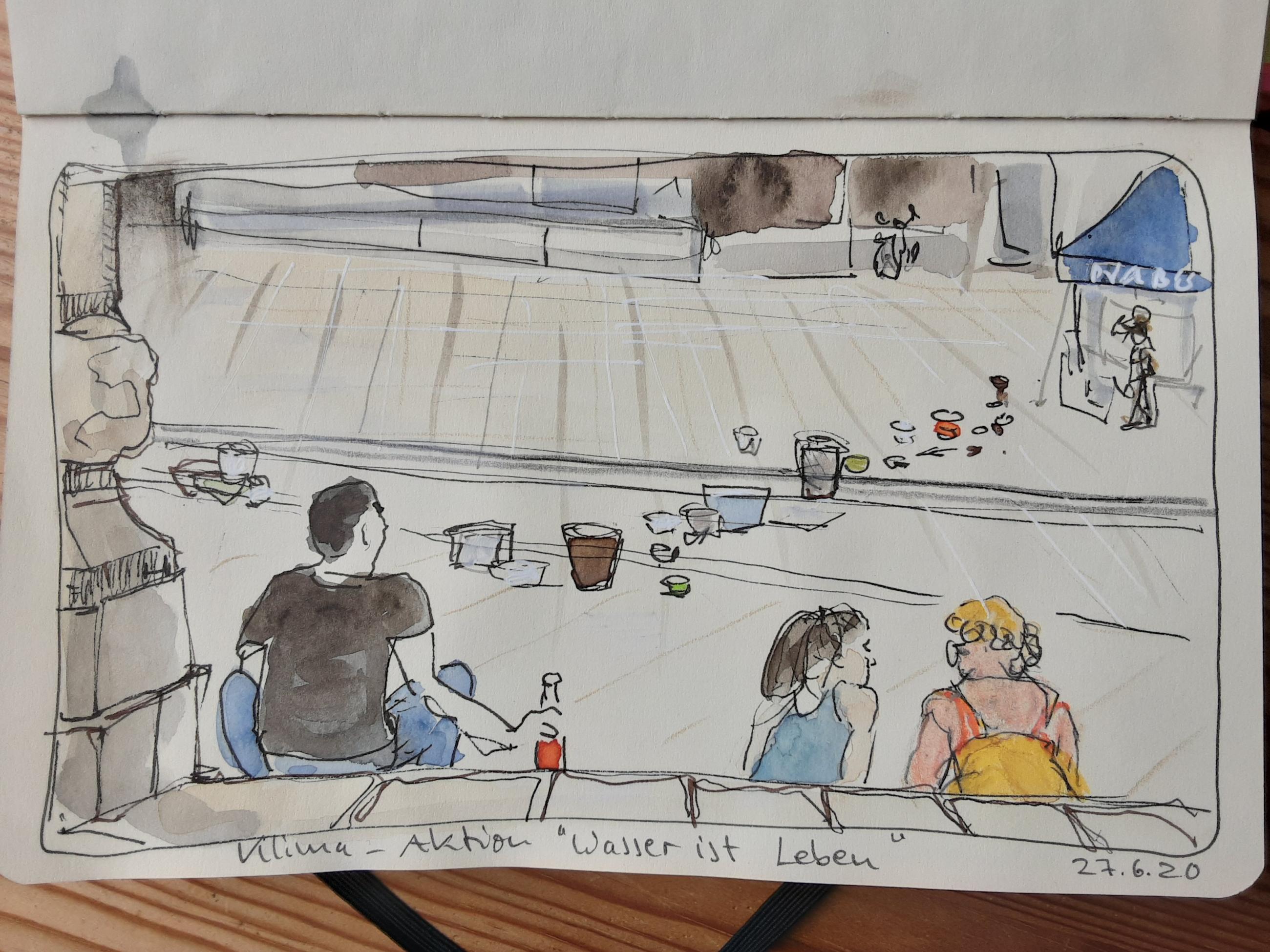 Schüsseln bildeten einen “Fluss” über den versiegelten Platz in der Innenstadt. Die Freiburger Altstadt ist laut Klimaanpassungskonzept der Stadt Freiburg buchstäblicher Hitze-Hot Spot.1 An den „Ufern“ konnten die Vorbeigehenden sich durch Bodenzeitungen und Schilder zu Wasser und Klima informieren. Ein Blickfang: ein großer Würfel zum Thema "virtuelles Wasser". Virtuelles Wasser ist die Menge an Wasser die anfällt, um ein Produkt herzustellen. Begleitet wurde die Installation von Tonaufnahmen mit plätscherndem Wasser und einem kurzen Redebeitrag.