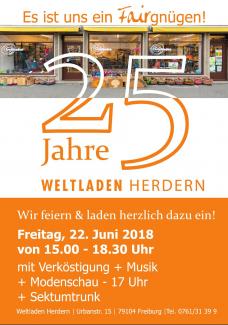 Wir feiern 25 Jahre Weltladen Herdernund laden herzlich dazu ein!Wir feiern mit Musik & Modenschau (17 Uhr)mit Glücksrad & Rabattaktionen,mit Verköstigung & Sektumtrunk!Gerne stoßen wir gemeinsam mit Euch an - wir freuen uns auf Euer Kommen!Euer Weltladen-Herdern-Team